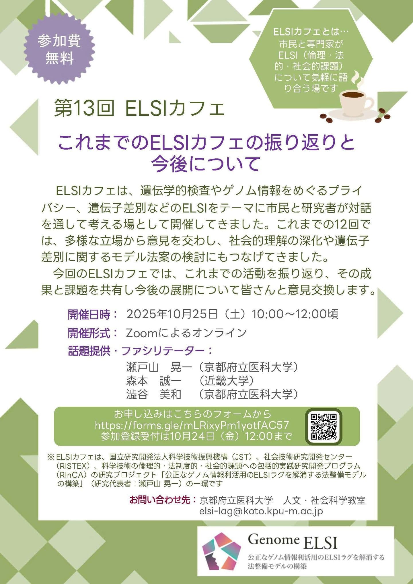 - 市民向け講座として、第13回ELSIカフェ「これまでのELSIカフェの振り返りと今後について」をZoomにて開催いたします。