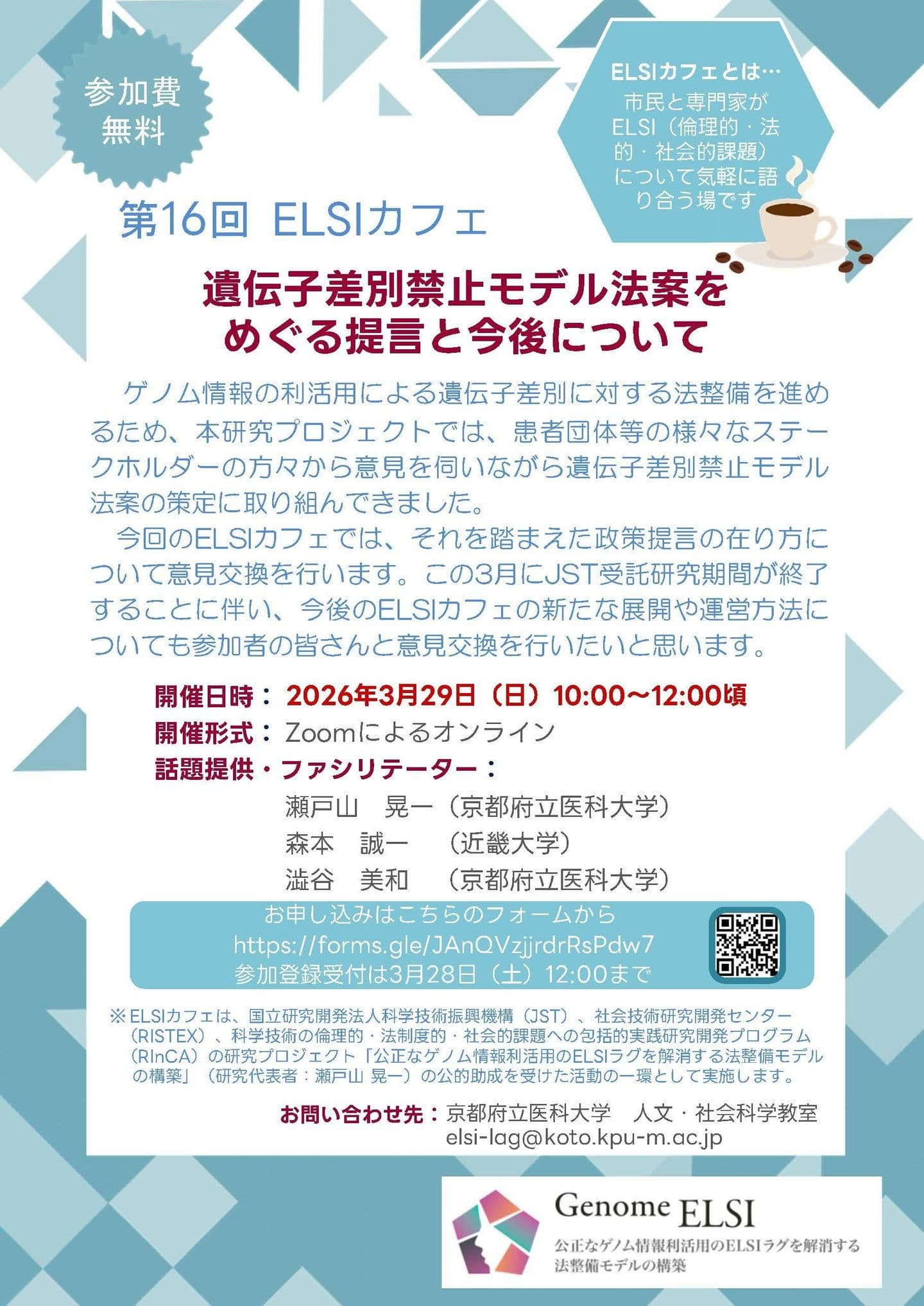 | 第15回ELSIカフェ | 遺伝子差別禁止に係るモデル法案をめぐるステークホルダーとの対話の共有 | 2026/2/14 |